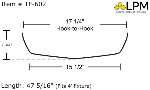 LPM 4′ Wrap Around Lens 17 1/4″ Max Width by 2 3/4″ High (TF-602). Actual length is 47 5/16″ (fits 4′ fixtures). Made with clear prismatic diamond pattern acrylic.