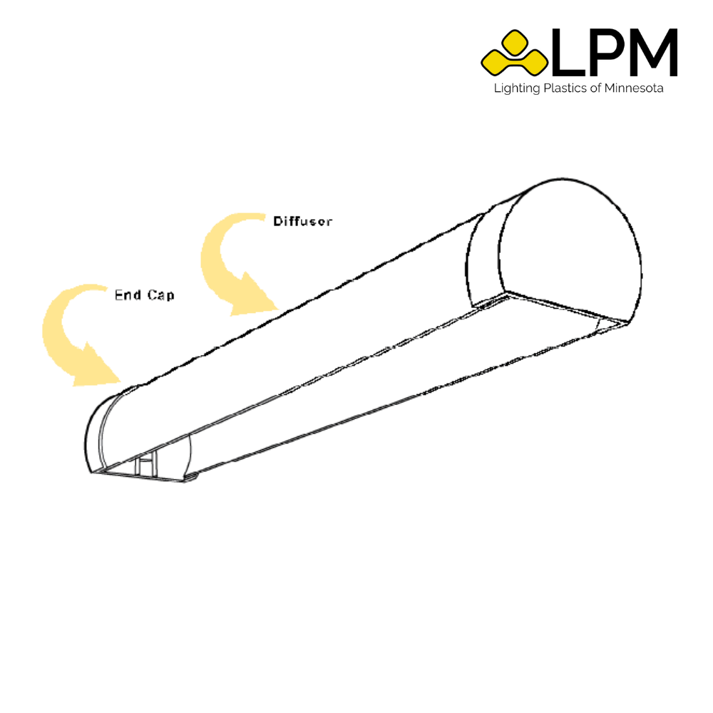 Milk white rounded 4ft diffuser with end caps to cover strip fixture for use with fluorescent or LED bulbs.
